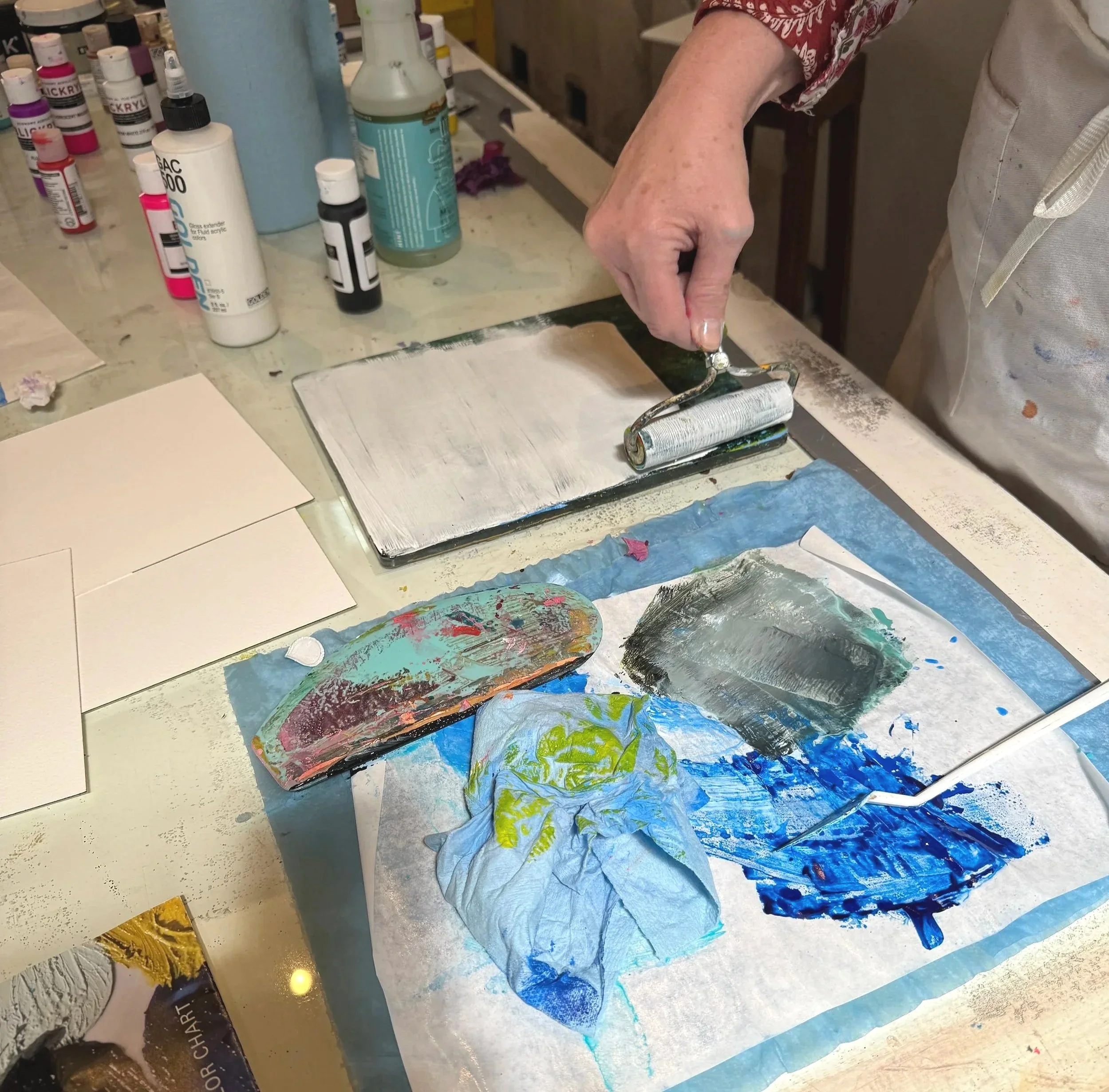 We’ll be using acrylic paint, Akua inks, block printing, monoprinting, painting, and gel plate techniques, participants will generate a rich range of marks, symbols, patterns, and textures. Printed elements and painted surfaces will become source material for collage, allowing images to evolve through layering, repetition, and transformation.